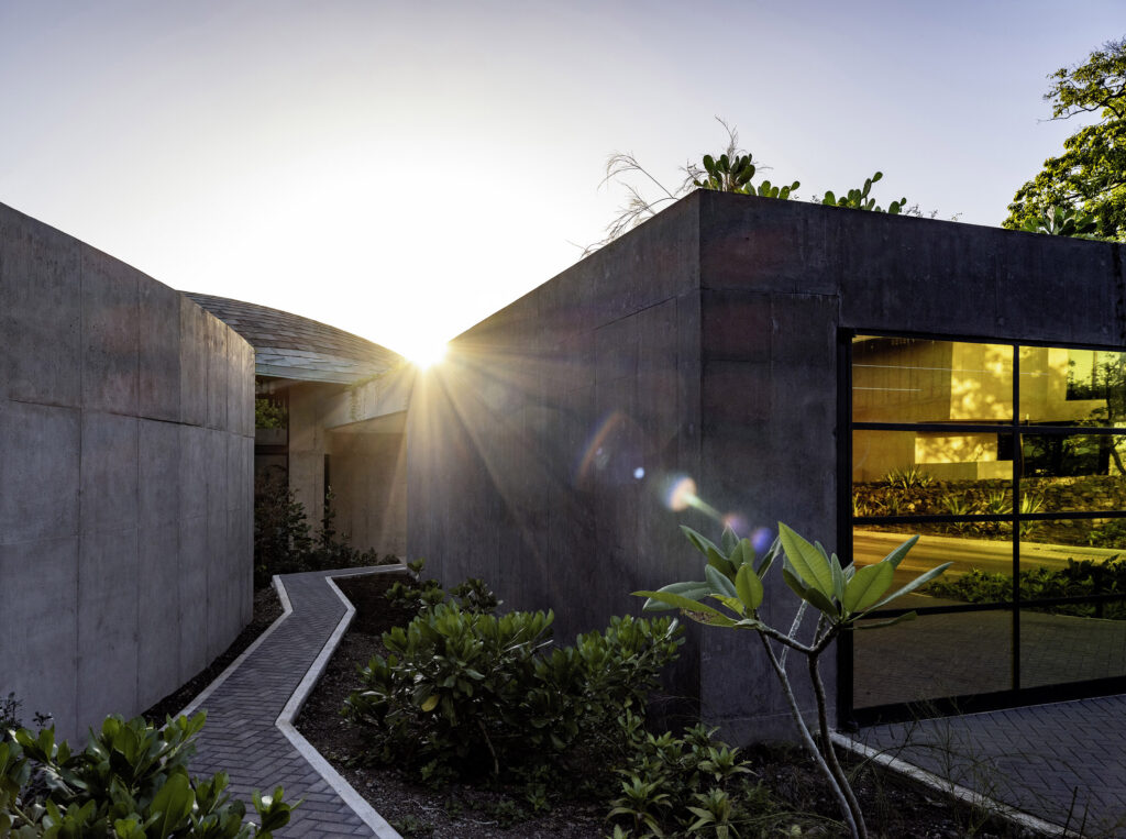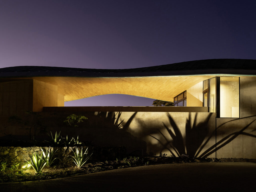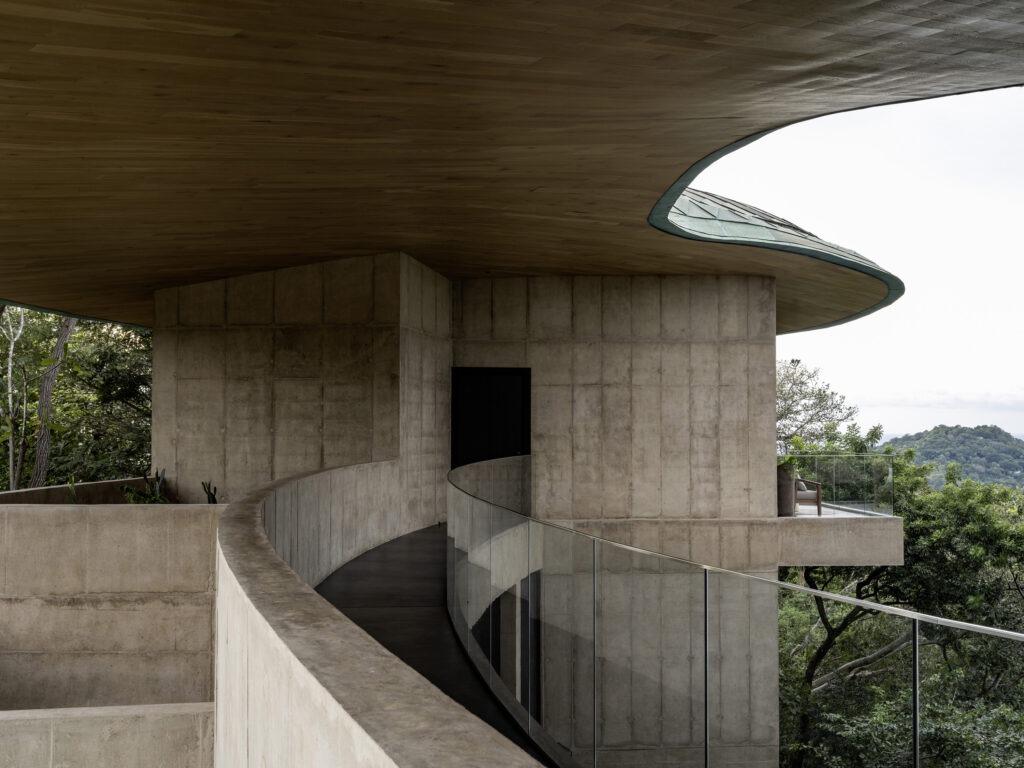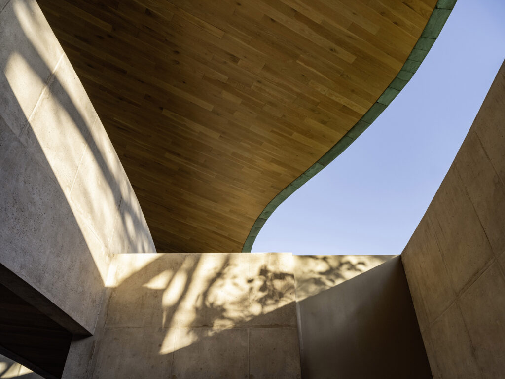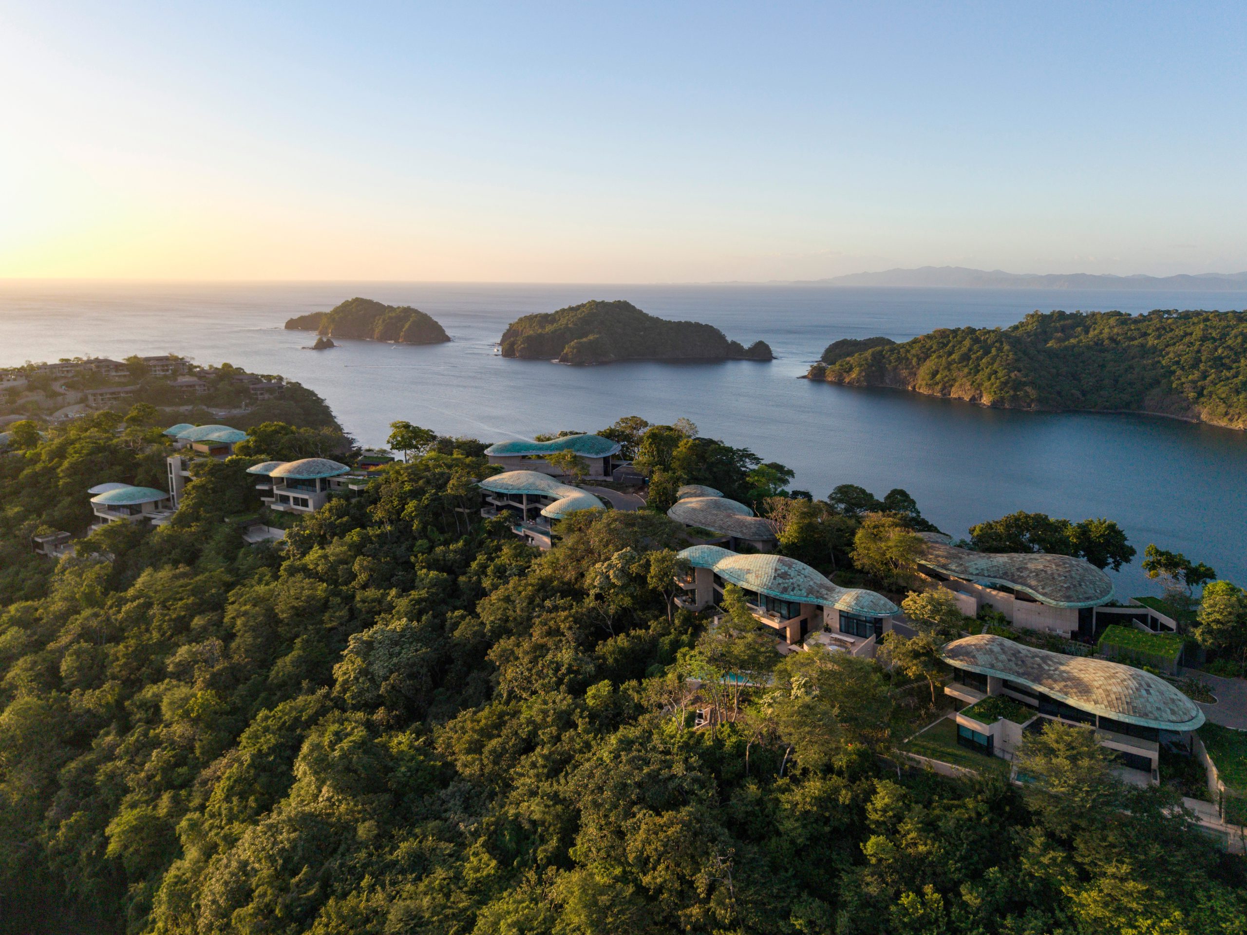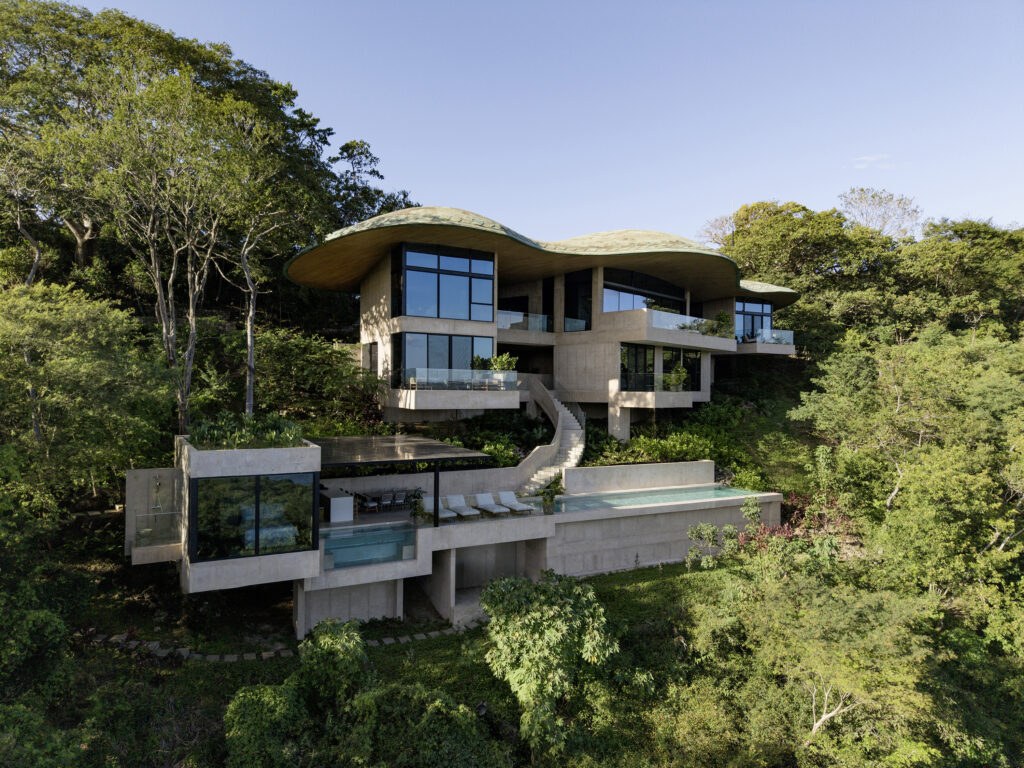 Though they appear to hover above the terrain, the 4–5-bedroom villas and their swimming pools are sited to meld with the land. The line between site and architecture blurs until it’s hard to tell where one ends and the other begins. Seen from above, the sweeping compound curvature of the copper roofs becomes an abstraction of the tree canopy. And like roots finding fissures to grip the bedrock, the homes are grounded in earth even as they reach for the sky.