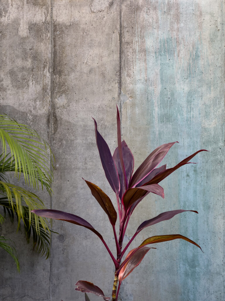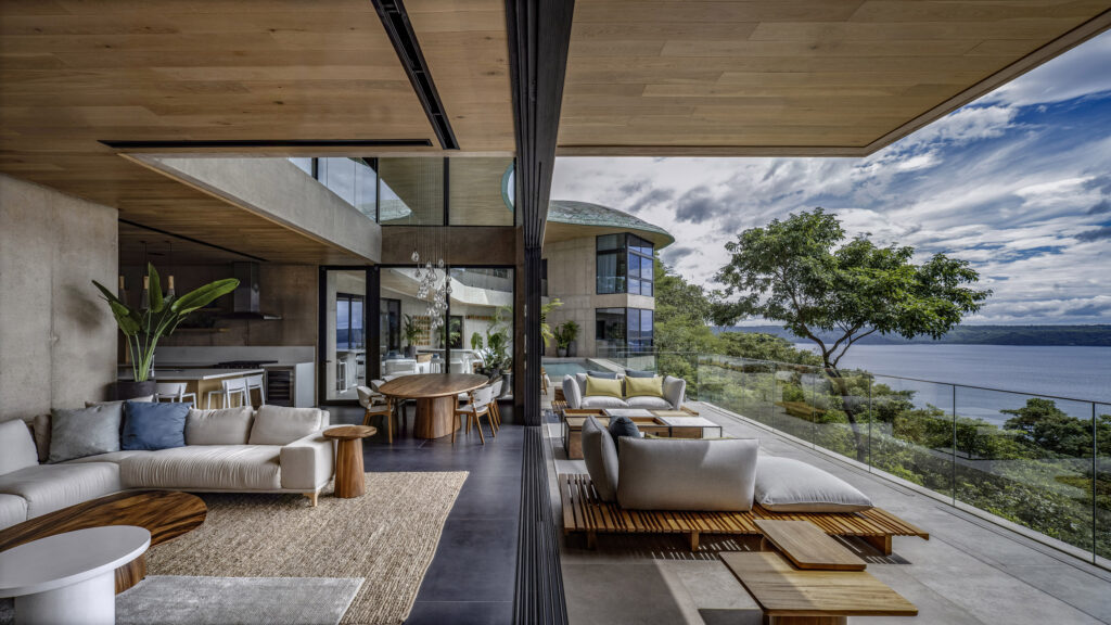 Cantilevered decks open to an uninterrupted horizon of ocean, while the undulating roofline softens the force of tropical rain. The indoor-outdoor spirit is augmented by necklace walls of volcanic stone, still used by local farmers, that lend privacy between villas. Garages with dichroic glass doors shift color like petals layered beneath forest trees.