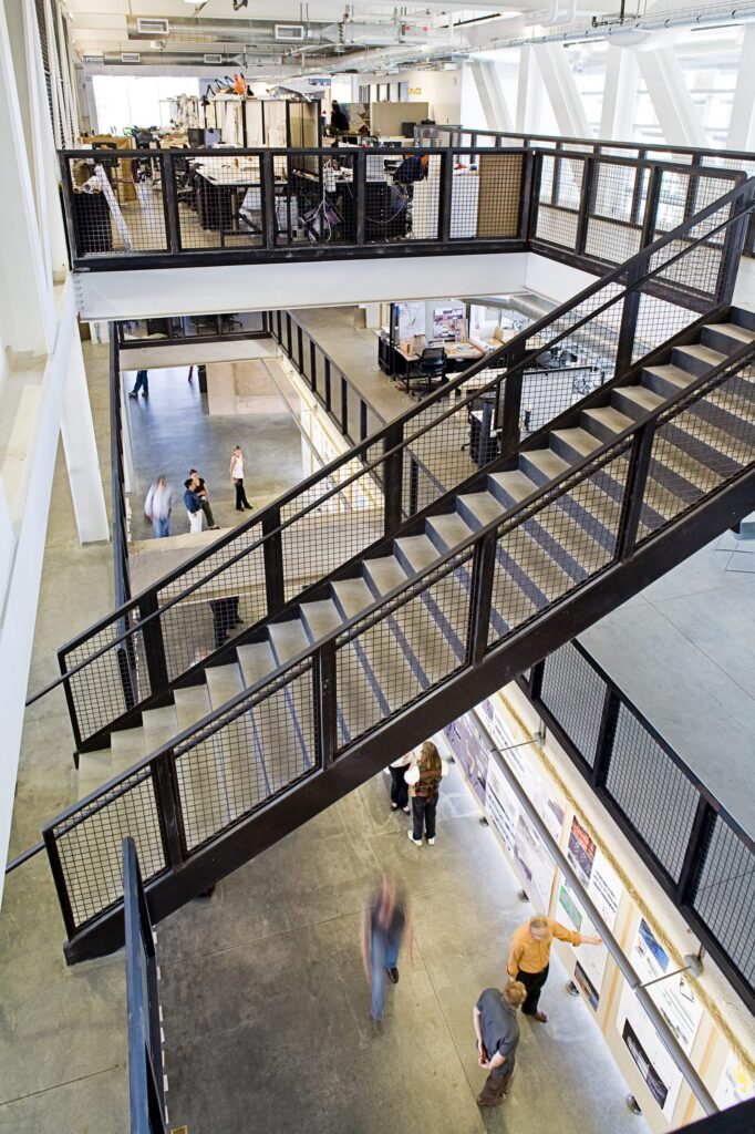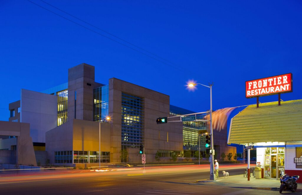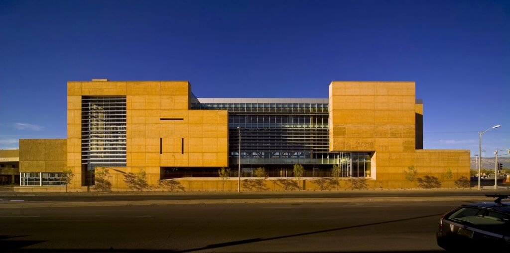 Hung from four 90-foot-long steel trusses, also supporting the top floor Fine Art’s Library, the central studio floats over a sunken courtyard, while exposed structural, mechanical and electrical systems create a living architecture lab. As much an ode to the landscape surrounding the City as it is to the urban nature of the campus, Predock likened the building’s earth-tinted concrete wall overlooking Central Avenue to the cliffs of Canyon de Chelly in Arizona, as well as to “the mute, powerful walls of Anasazi architecture” seen at Chaco.