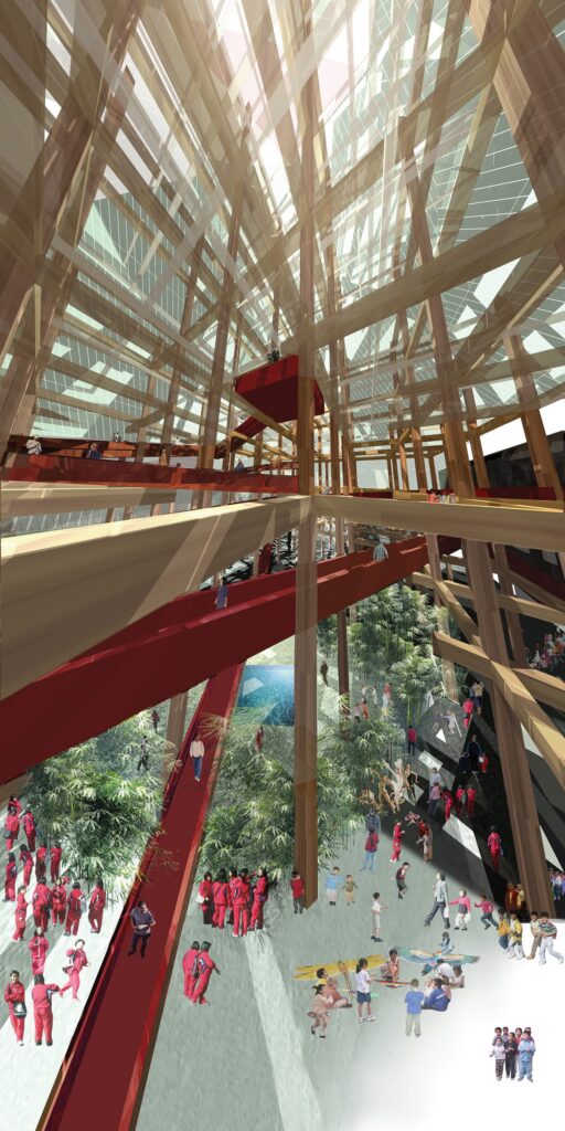 A shimmering central glass peak, structured with a forest of timber columns inspired by Tang Dynasty architecture, shelters the courtyard and bathing areas. Unbuilt yet resonant, the museum remains a visionary design, poised between earth and sky, embodying Predock Studio’s reverence for site, memory, and innovation.