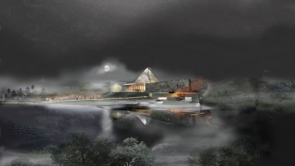 The pastoral site is reimagined as an island encircled by a tranquil lake, with gardens that echo regional terrains. Designed to house the museum’s expanding contemporary collections, the building unfolds like a storyboard, its spatial choreography fluid and cinematic. Visitors approach across illuminated causeways entering through a light filled aperture before ascending gentle ramps that recall the rhythm of an unfurling Chinese scroll. Bronze clad galleries etched with calligraphy derived from Buddhist sutras float above a stone plinth housing the museum’s back-of-house functions. Within, wood lined rooms evoke traditional artisanal boxes for video art, sculpture and painting.