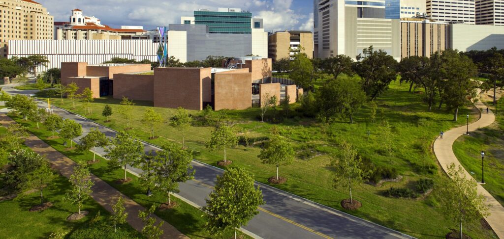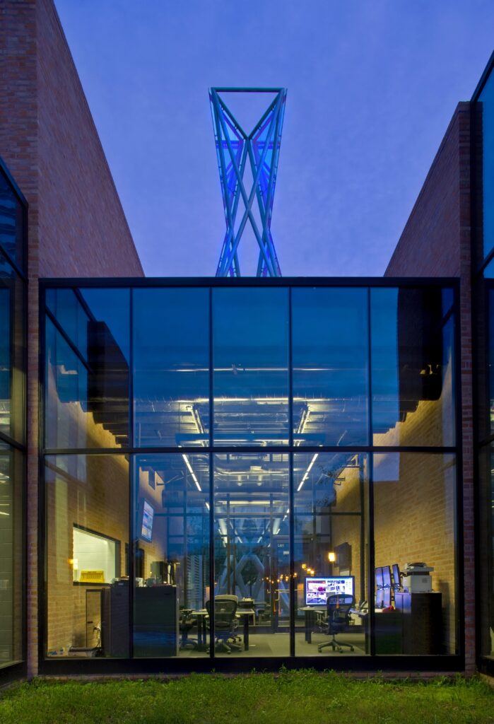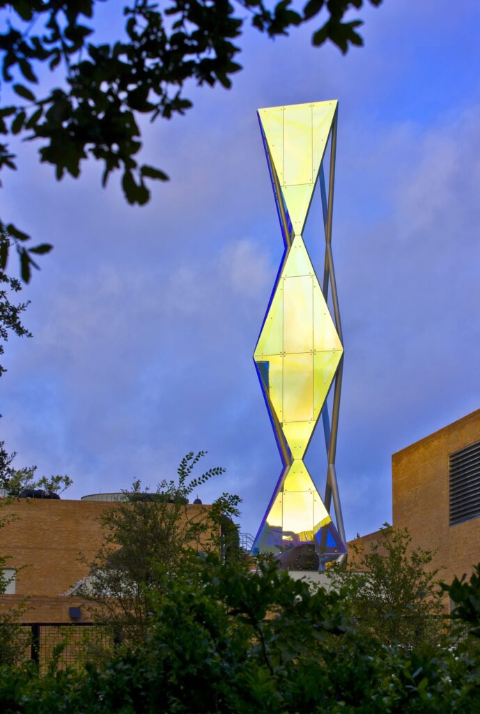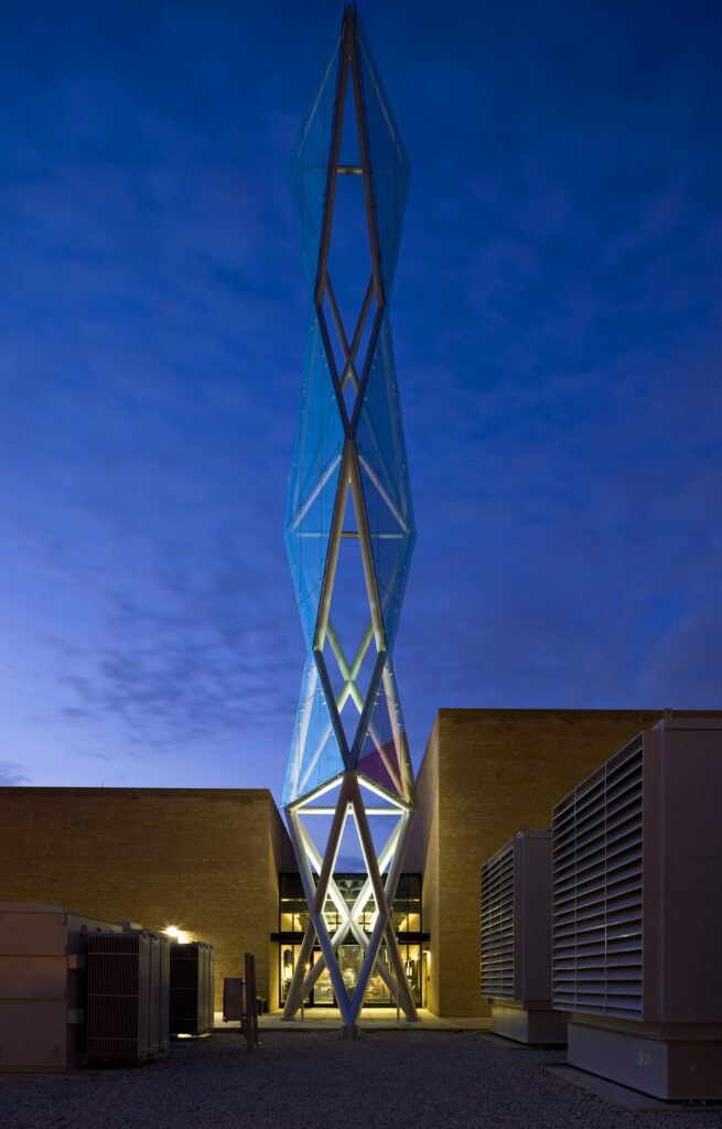 Rising up behind the controls room is a flue tower wrapped in dichroic glass, abstracting the storied brick chimney on Rice’s still functioning 1920’s power plant. The flue tower rises up to meet the scale of the medical towers along Main Street. By day the tower casts mercurial veils of color and light that shift and at night, the tower becomes a prismatic beacon.